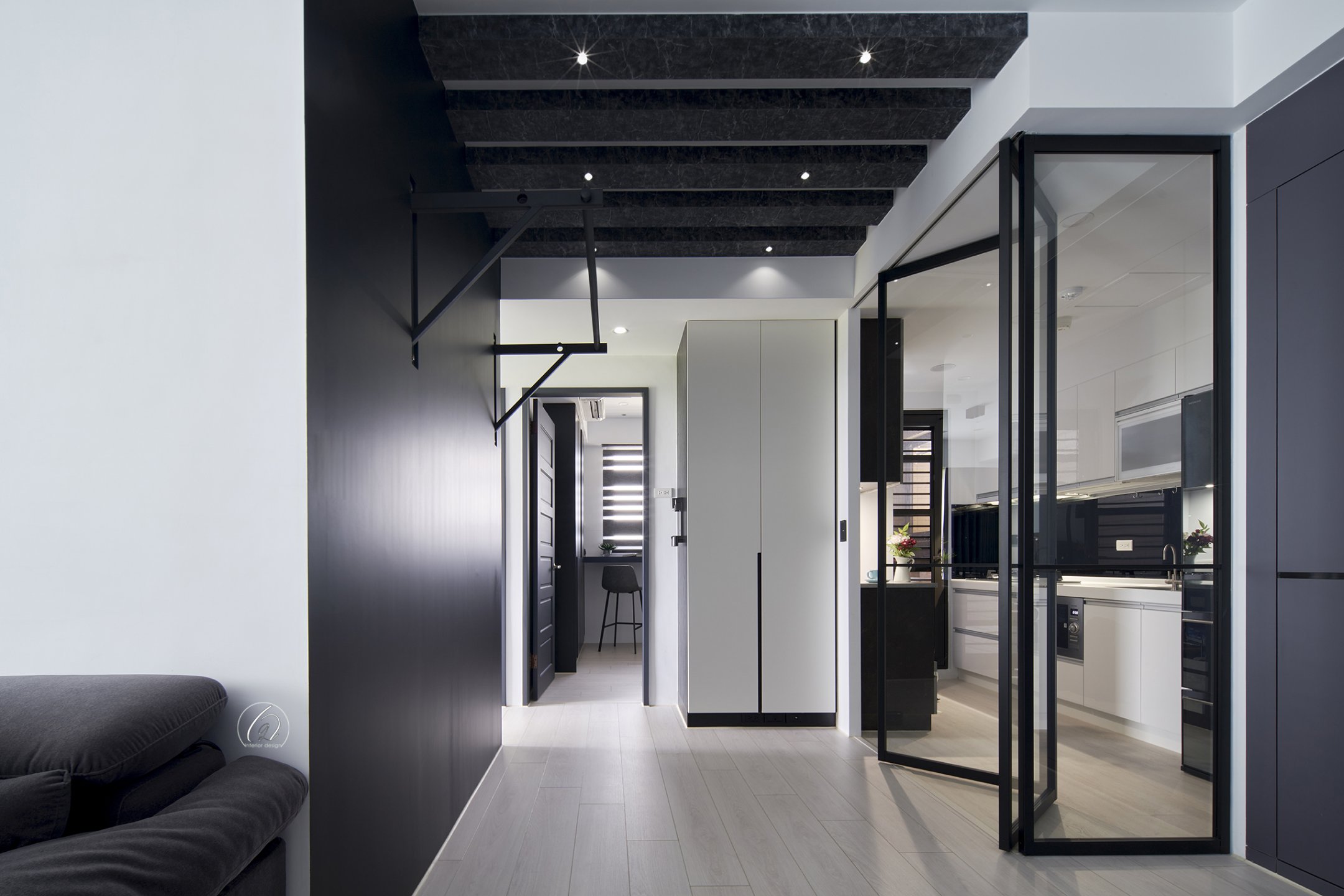 廊道以黑板牆面搭配黑色石紋天花,延伸出俐落節奏;折疊玻璃門讓廚房保持通透,光影交錯間兼顧機能與質感,讓日常動線更顯靈活自在。