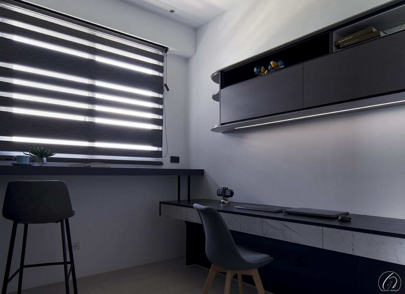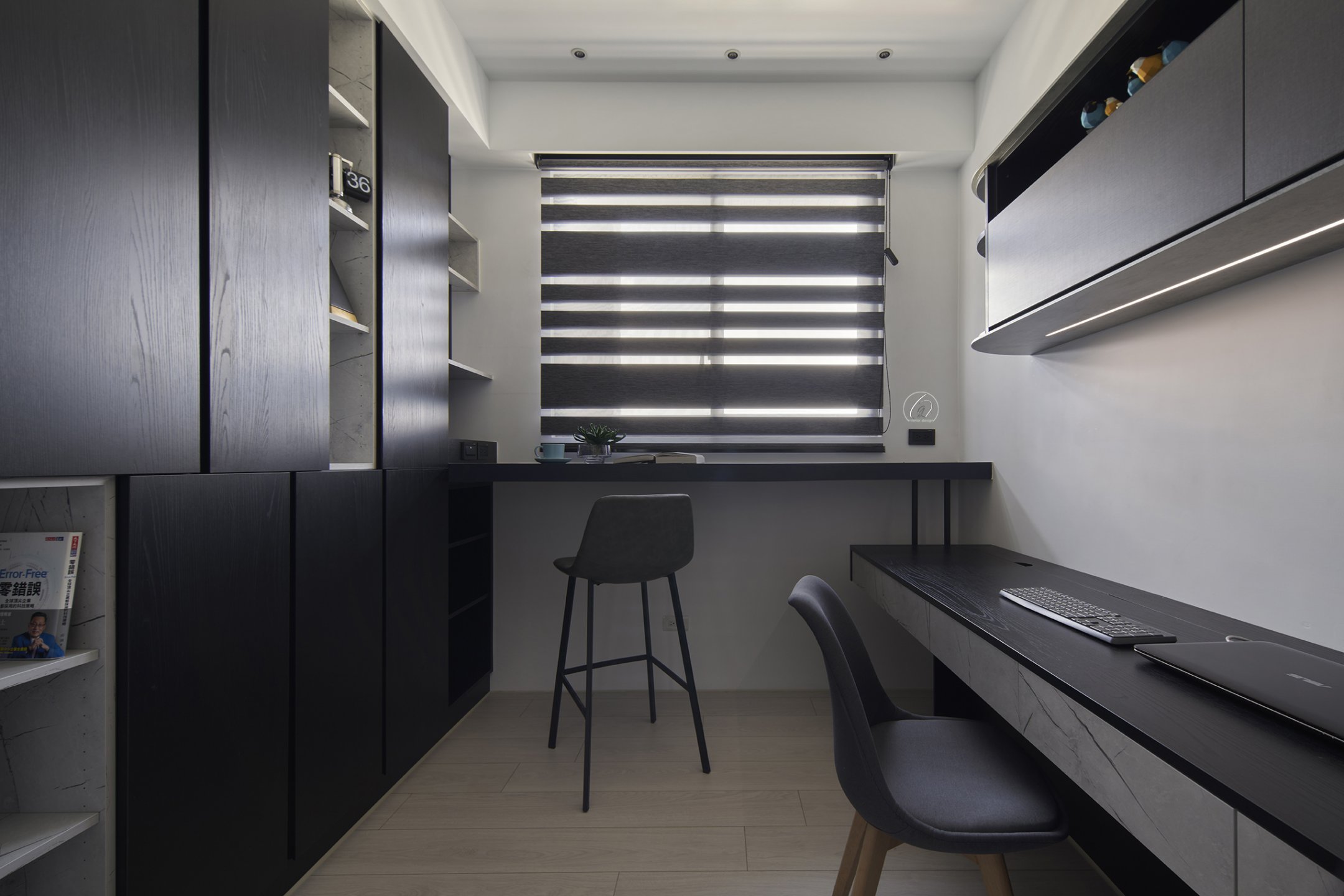 以俐落的黑白灰調構築工作區,層板與檯面選材沉穩,搭配間接燈帶,讓功能與美感兼備;光影與線條交織,靜心專注的氛圍隨之生成。