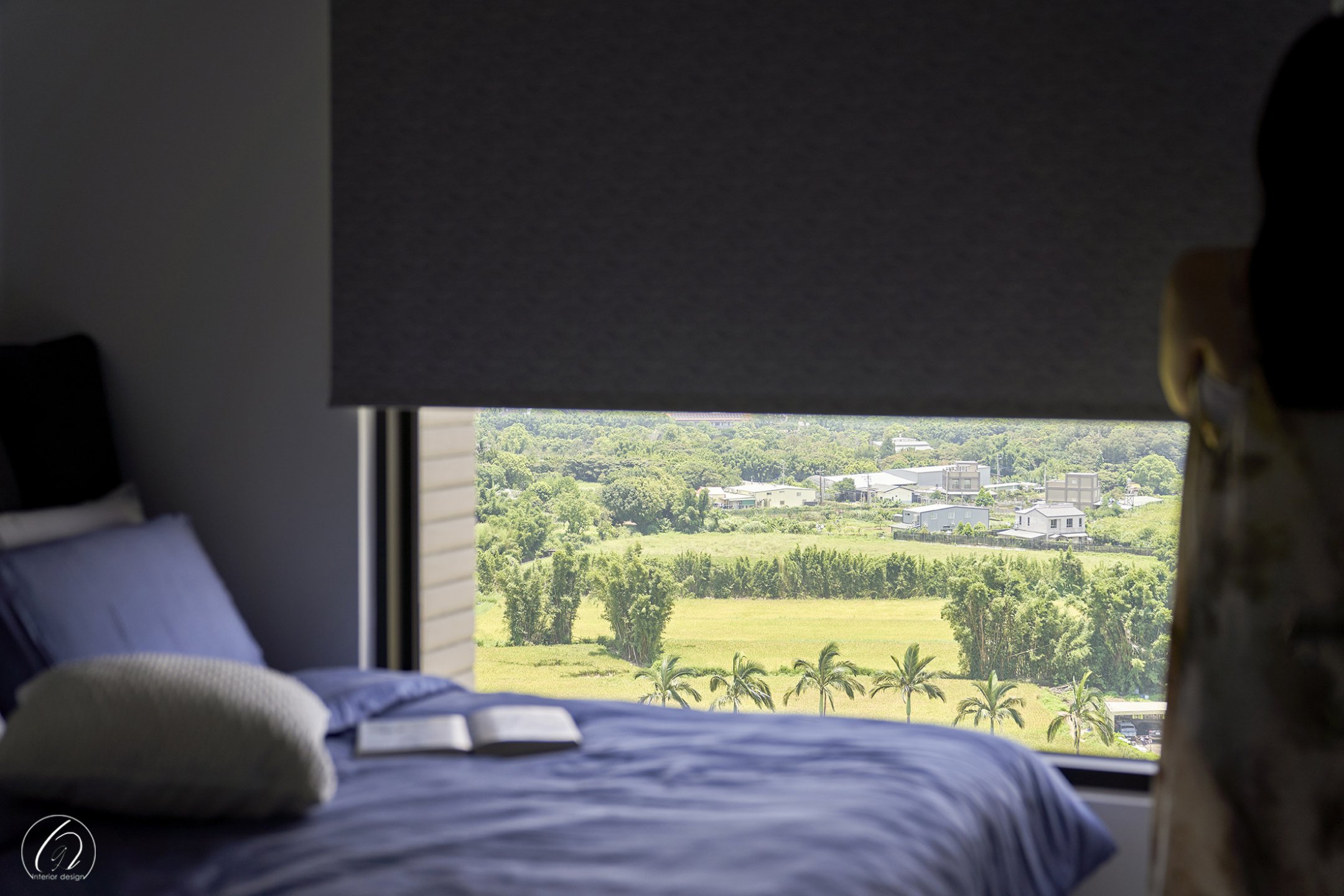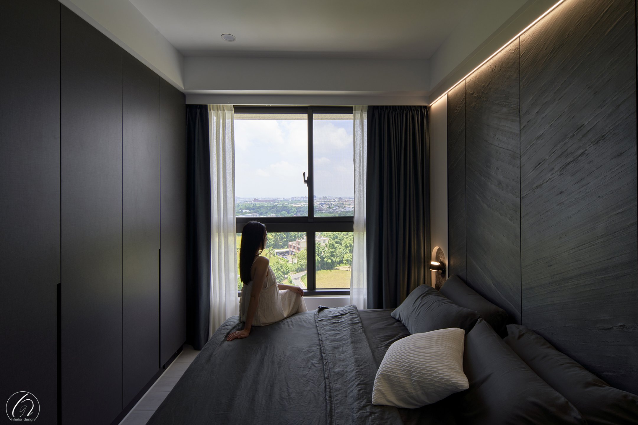 臥室以深灰質感營造靜謐氛圍,大面窗景引入自然光影。倚窗凝望遠方,城市與綠意交織,讓空間更添詩意與日常溫度。
