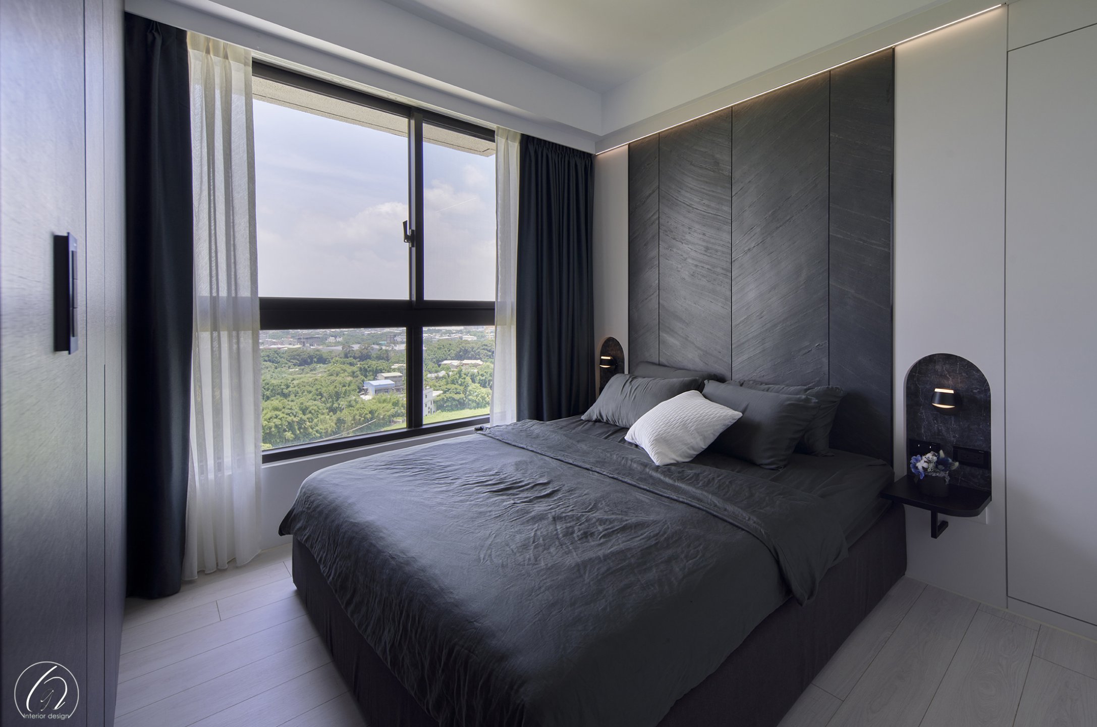主臥以深灰床品與山型石紋背板營造沉穩氣場,大面窗引入自然光景,搭配簡潔線條與溫潤燈帶,呈現靜謐卻富層次的休憩氛圍。