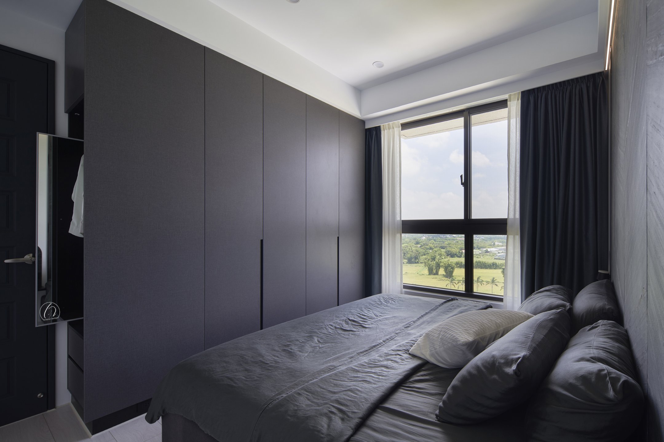 靜謐的臥室設計,以深灰色調展現沉穩氣質。窗景引入自然光,搭配極簡衣櫃與柔和床品,營造舒適休憩氛圍。空間純粹簡潔,留白中蘊藏細膩層次。