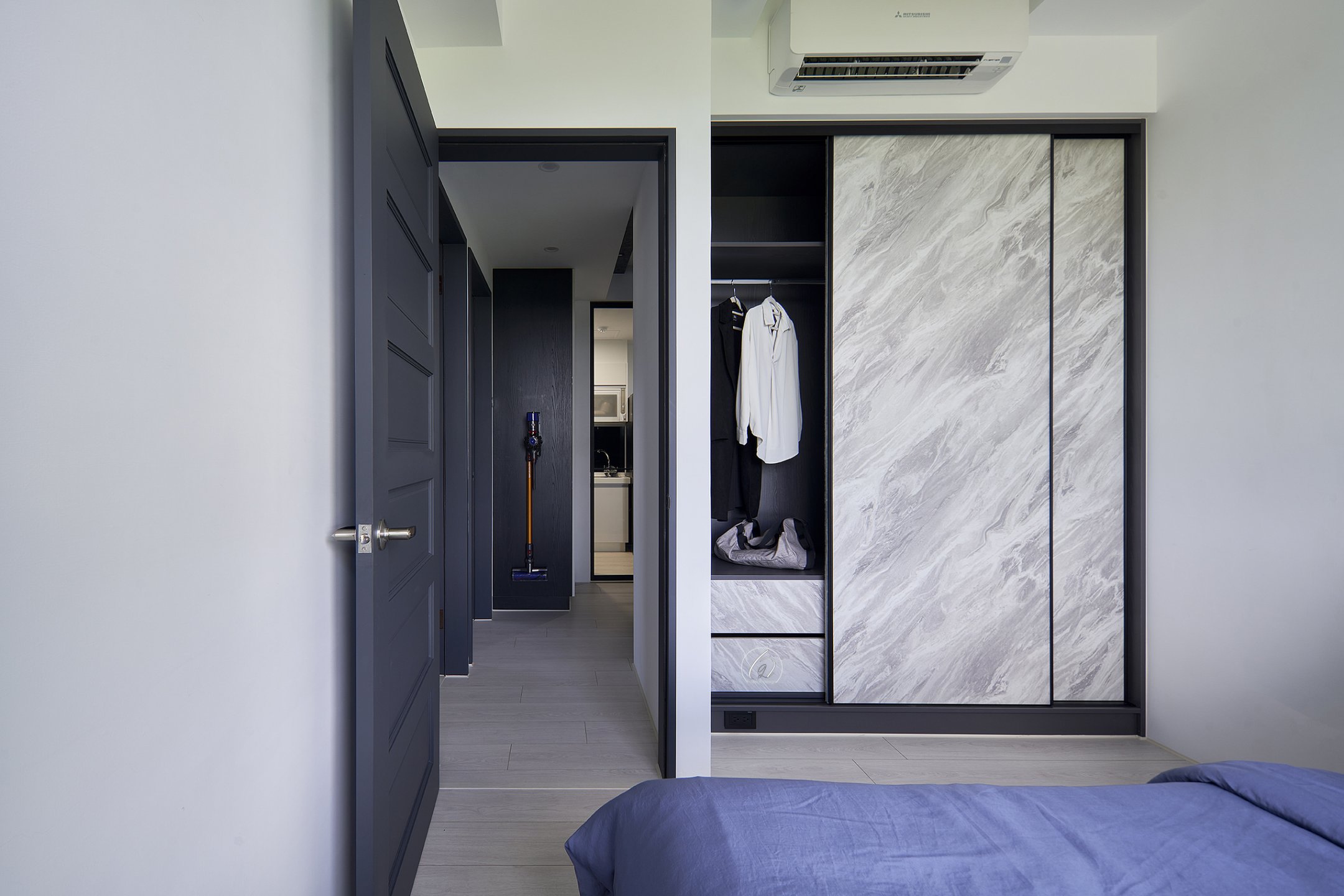 石紋推門結合深色木質,展現沉穩內斂的臥室格調;俐落線條與柔和光感交織,收納與美感兼具,靜謐中蘊藏秩序之美。