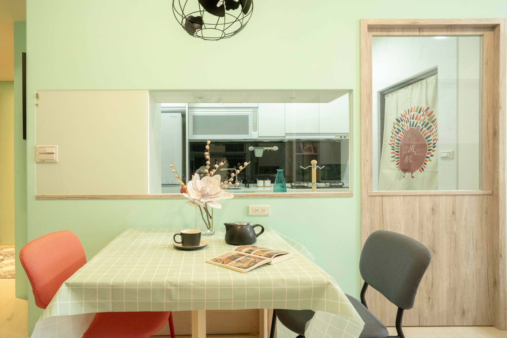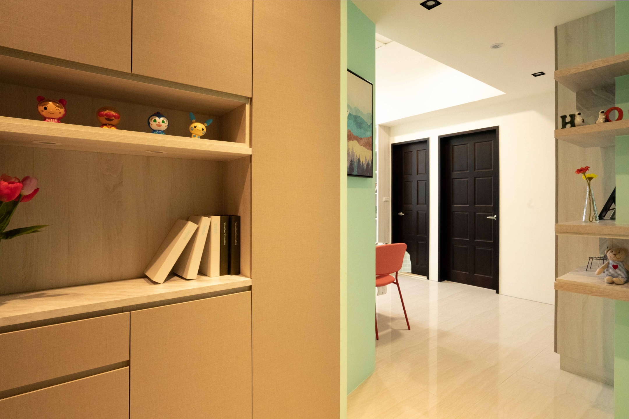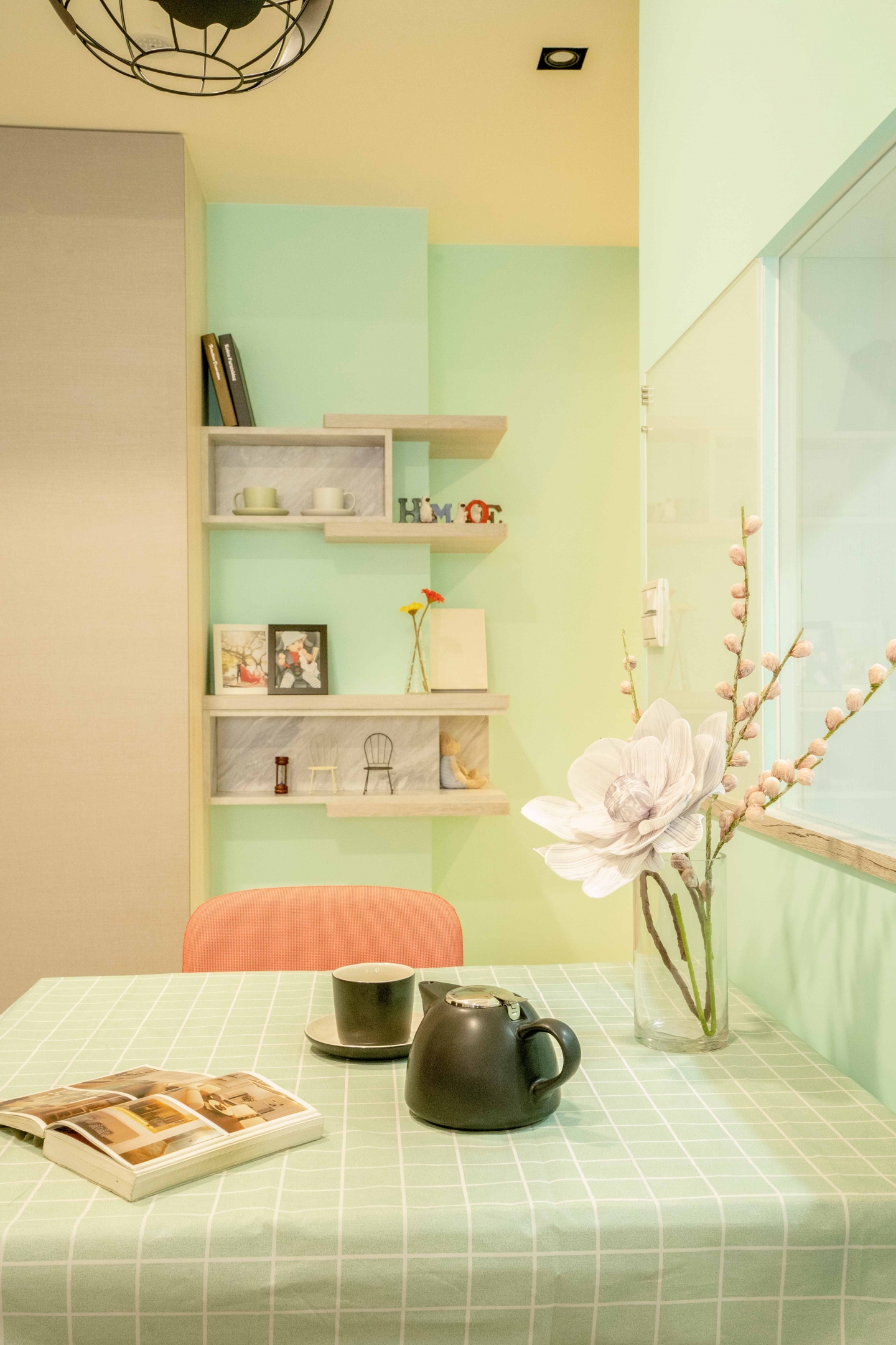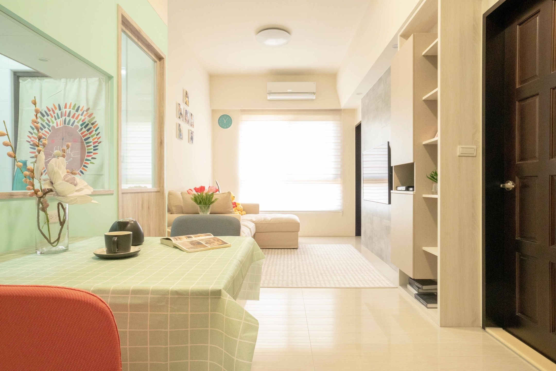 #玄關 一進門的#鞋櫃 有著不弱的#收納,中段留空的設計,讓手上的小東西可以安放~轉角處牆面的斜度退縮,搭配#湖水綠#乳膠漆 跳色,讓過渡空間視覺上不擁擠,也有個好心情。原本建商標配的開放式#廚房,讓天天下廚的女屋主望之卻步,所以做了隔間來阻斷油煙,廚房內增加了#電器櫃與#備餐櫃,小空間卻獲得大大的利用。#餐廳 牆面及門片也採用了透空加清玻璃的方式,視覺上營造出#半開放式廚房 的感受~開關處的#磁性烤漆玻璃 可以書寫也能用磁鐵吸附.便條紙.帳單發票,可以當成媽媽的會計區了XD,餐桌後方的樑柱過大,製作層板展示區加上旁邊的#收納櫃 來改善格局先天的缺陷,沒什麼很厲害花俏的設計,但有著以使用者為出發點的用心