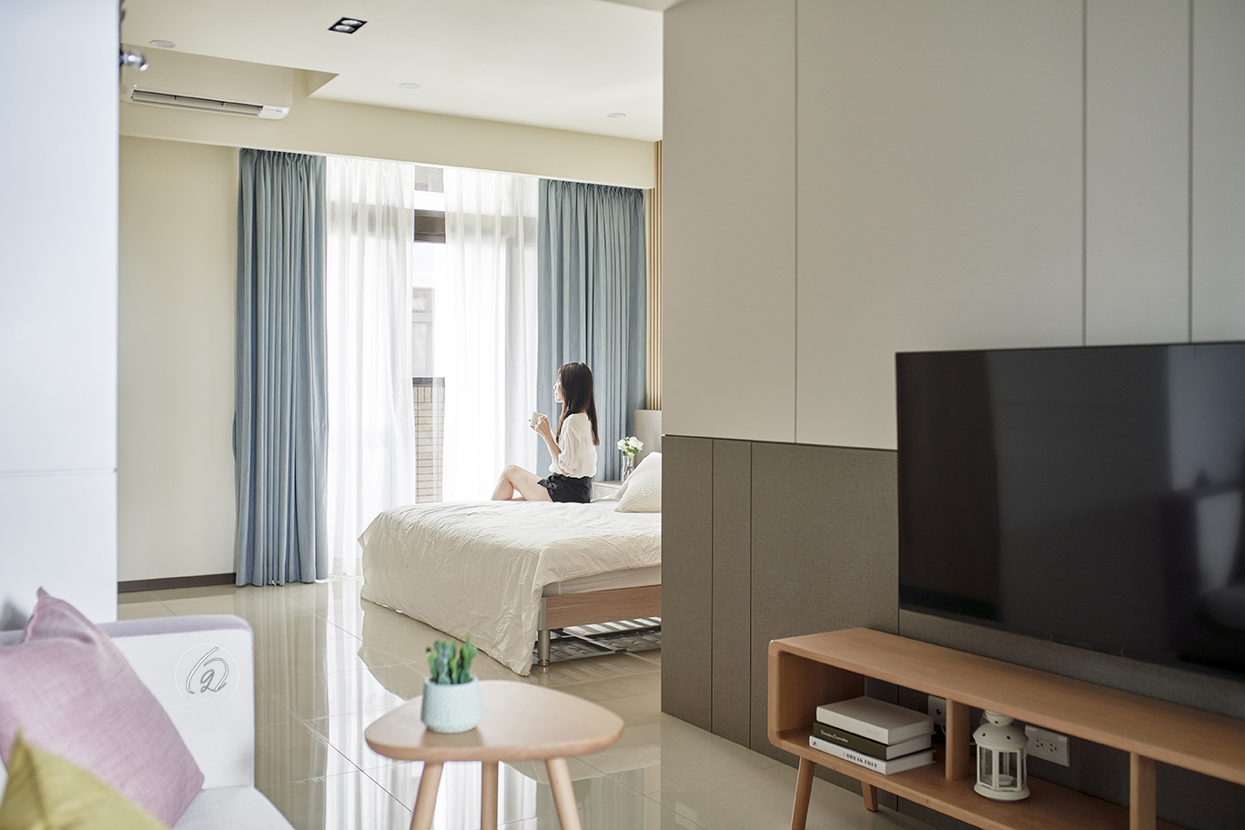 午後陽光灑落臥室,輕柔映照床鋪與淺藍窗簾,營造安定放鬆的氛圍。簡約電視櫃與收納櫃體延展視覺,讓休憩與生活串連成一幅靜謐的畫面。