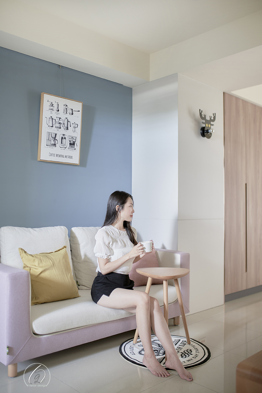 灰藍與粉紫交織出柔和調性,木質小桌與淺色沙發互相呼應,營造出既療癒又放鬆的角落氛圍,適合靜心閱讀或品茶,將生活的節奏慢下來,感受空間的溫度。